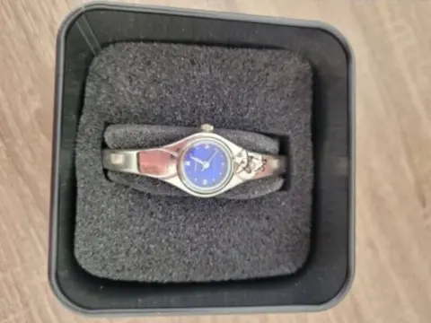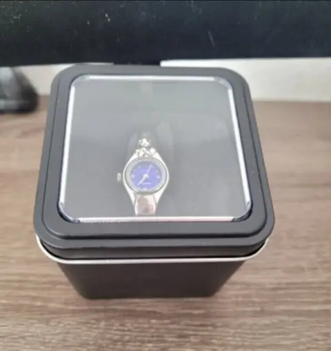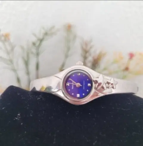 Reloj Pulcera de mujer en acero Inoxidable, con fondo azul marino y numeros plateados, cierre de broche de precion, tiene 5cm de circunferencia, trabaja con pila, elegante diseño para lucir en modo casual o formal y atraer las miradas viene en estuche de metal para guardar