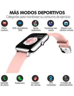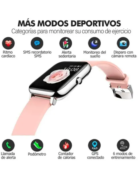 Smart Watch modelo P22B1, deportivo e impermeable, Bluetooth, nuevo, con su caja, cargador, instructivo y dos correas de silicon, una rosa y una negra. En la última foto se ven las especificaciones