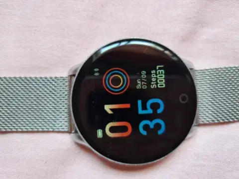Smartwatch color plata, un reloj bonito para cualquier outfit; mide pasos, monitor de sueño, mide frecuencia cardíaca, mide oxigenación, presión arterial, visualiza el clima, puedes manejar tu música y llegan notificaciones de WhatsApp. Solo se uso como 3 veces, esta como nuevo. Y se sincroniza con una App.