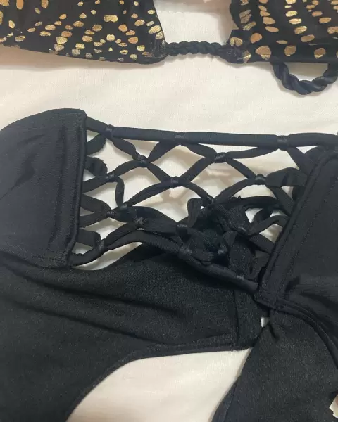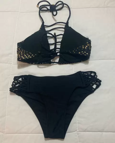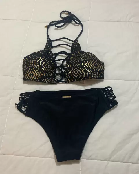 Hermoso, elegante y sexy bikini T/xs, negro con dorado, excelente estado, sin detalles.