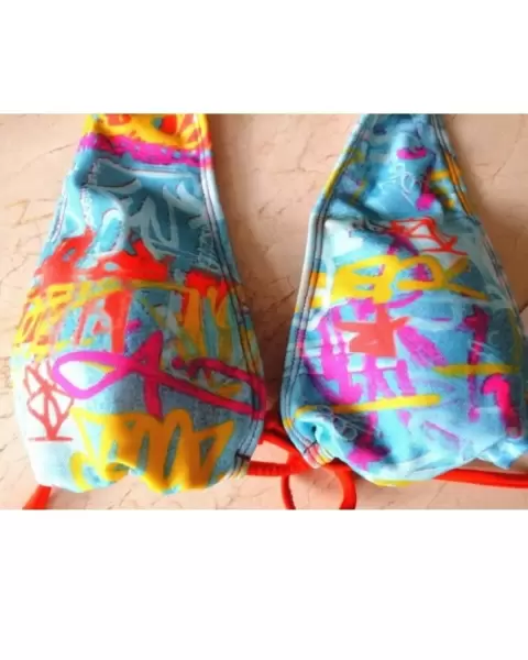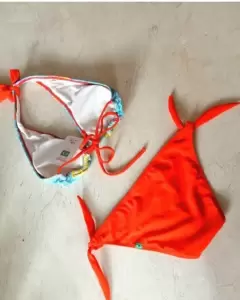 Es un bikini brasileño, con calzón naranja y sostén color azul cielo con estampado de colores. Se ajusta al cuello. Es talla S pero queda a M también.Está nuevecito!!!. Es de diseñador brasileño