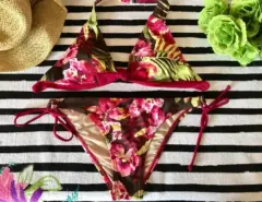 Bikini estampado floral. Bikini de 2 piezas, estampado floral predomina el color guindo, disponible en talla S/M, top con detalle de moño al frente, tirante halter, bottom con listones a la cadera. Producto nuevo, con etiqueta, marca Marina West. Luce este modelo en la playa o en la alberca del Club. Cómodo, clásico, tierno y sexy a la vez!