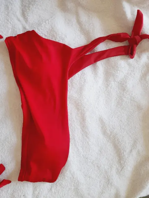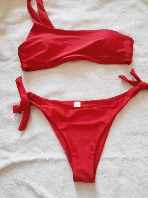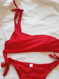 Traje de baño Rojo, se uso una o dos veces aun tiene su protectorQueda a talla M/L el cazón tiene amarres y se adapta a tu cadera, el Top trae copas es muy cómodo