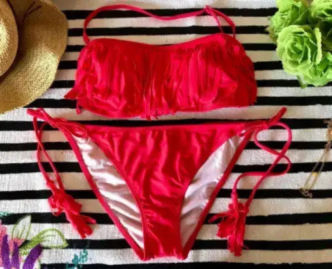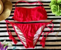 Bikini de 2 piezas, color rojo, disponible en talla S y M, top de flecos al frente y tirante halter, bottom ajustable a la altura de la cadera. Producto nuevo, con etiqueta, marca Marina West. Luce este modelo en la playa o en la alberca del Club. Tierno y Sexy a la vez!