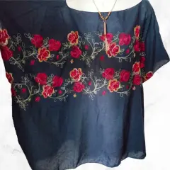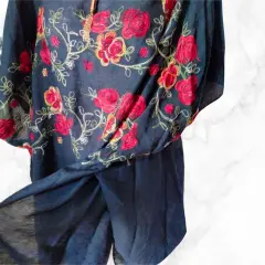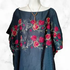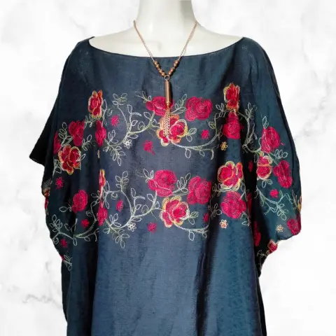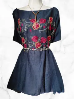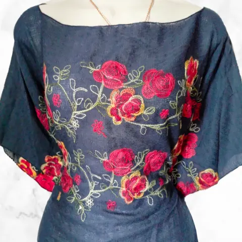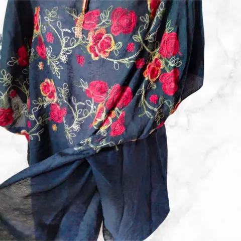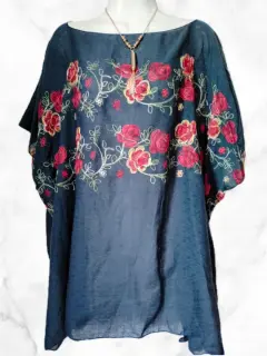 Diseño de Rosas bordadas a mano. El diseño Flores lo tiene en ambos lados y es bordado a ManoQueda a talla Grande a extra grandeEs unitalla (Oversize)90 cm de axi-axi70 cm de largoSe ajusta, o lo puedes usar holgado.Dejo fotos de diferentes maneras en como lo puedes utilizar
