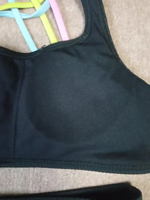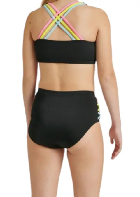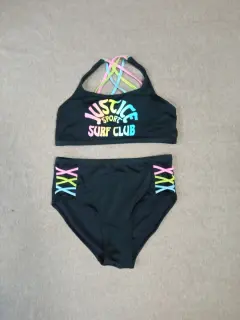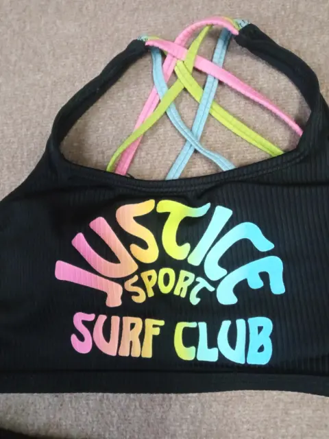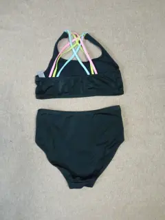 Justice Bikini Deportivo de 2 Piezas niña con Multi correa y Detalle de Encaje talla grande 10-14. Medidas: parte superior 26 cm largo ( con tirantes) 14 cm de alto top ( sin tirantes) y 33 cm de ancho.Parte inferior: 27 cm de largo, 60 cm de ancho de cintura y 64 cm de cadera.Materiales: 84% poliéster reciclado y 16% spandex.Usado en una ocasión.