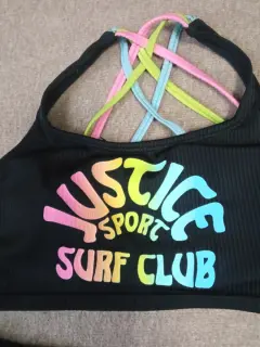 Justice bikini 2 piezas para niña.. Justice Bikini Deportivo de 2 Piezas niña con Multi correa y Detalle de Encaje talla grande 10-14. Medidas: parte superior 26 cm largo ( con tirantes) 14 cm de alto top ( sin tirantes) y 33 cm de ancho.Parte inferior: 27 cm de largo, 60 cm de ancho de cintura y 64 cm de cadera.Materiales: 84% poliéster reciclado y 16% spandex.Usado en una ocasión.