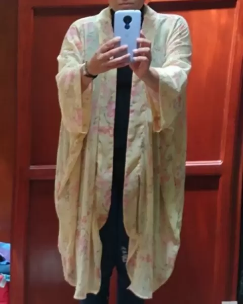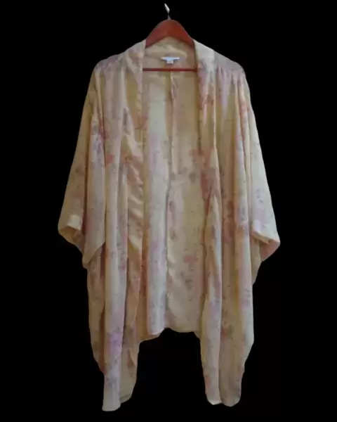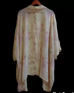 Hermoso ensamble tipo kimono, oversized de tela vaporosa color cremita con estampado de flores rosas pastel, es unitalla, super lindo*Talla Unitalla*Sin detalles*Calificación 10*GRACIAS POR TU PREFERENCIA*