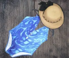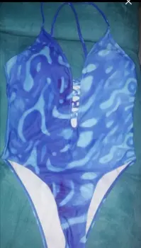 Lindo!!! , 🏝️🏝️🏝️traje de baño completo marca shein azul claro con estampado de grecas blancas tiras para ajustar talla M cruzado de la parte del pecho hacia la parte del ombligo
