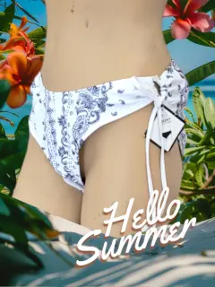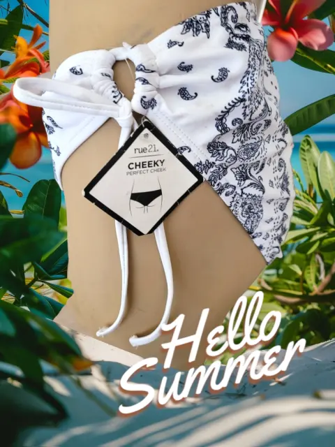 Rue 21 bikini parte baja shade and Shore cordones. Rue 21 bikini parte baja con shade and Shore cordones, Tala grande, color blanco con azul en graficos, elaborado con una mezcla de poliéster y spandex, ajuste cómodo, detalles de circulo con cordones, añaden un toque de elegancia, mide 36cm de cintura ajustable con 29cm de altura, cubierta total en parte trasera, nuevo a estrenar con etiqueta.