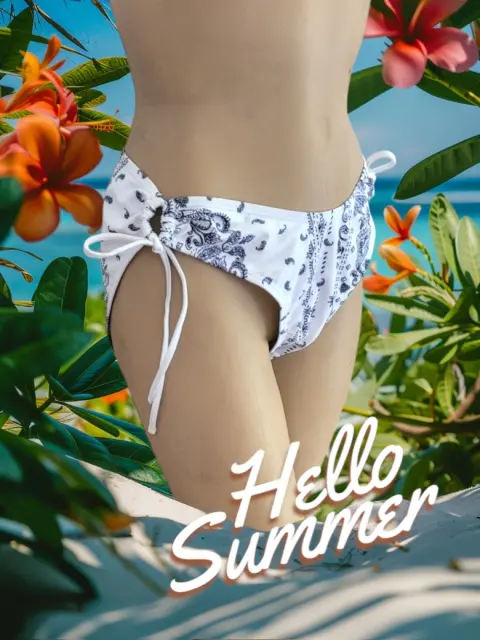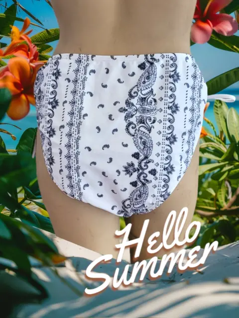 Rue 21 bikini parte baja con shade and Shore cordones, Tala grande, color blanco con azul en graficos, elaborado con una mezcla de poliéster y spandex, ajuste cómodo, detalles de circulo con cordones, añaden un toque de elegancia, mide 36cm de cintura ajustable con 29cm de altura, cubierta total en parte trasera, nuevo a estrenar con etiqueta.