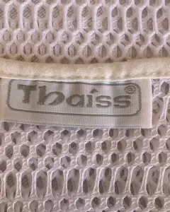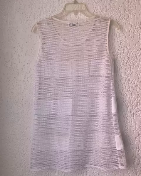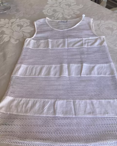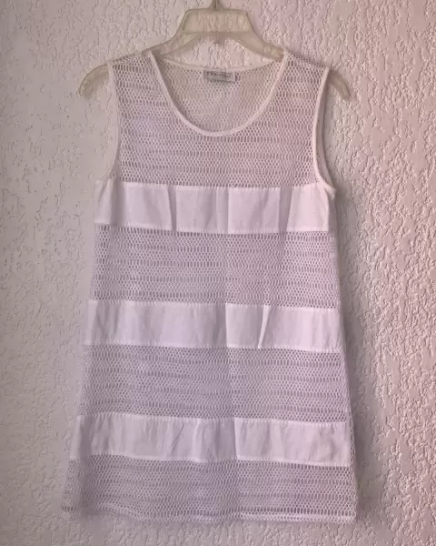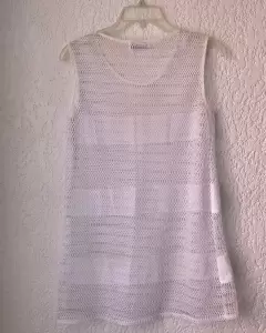 Bonita salida de alberca o playa, T/Ch , blanca, tipo malla y franjas de algodón de sisa a sisa 43 cm, largo 74 cm. Buen estado.