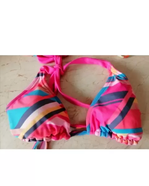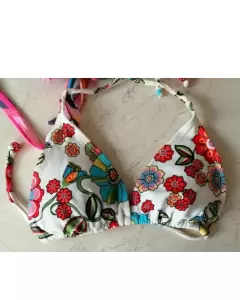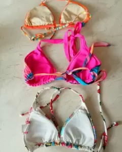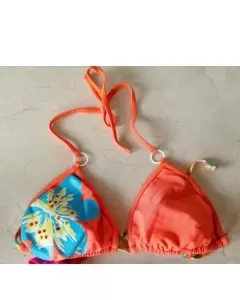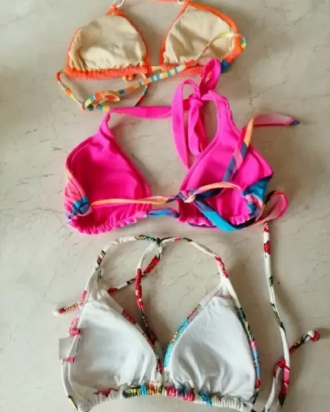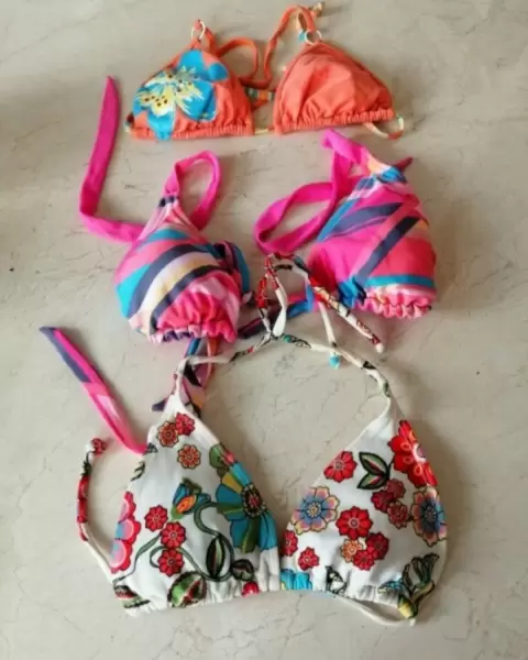 Son tres bikinis, sólo la parte de arriba, están en muy buen estado, uno es blanco de flores, otro rosa fiusha con rayas y el otro es naranja con una flor amarilla de estampado. Todos quedan a talla 32B o 34 B, ya que se ajustan por el tirante