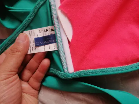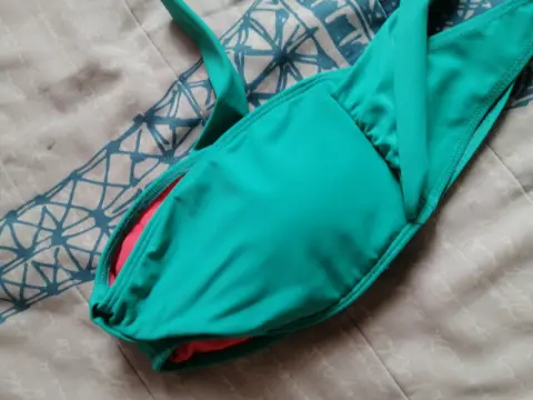 Top de traje de baño color verde, tipo halter, se amarra por detrás haciendo un moñito