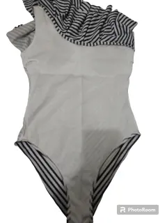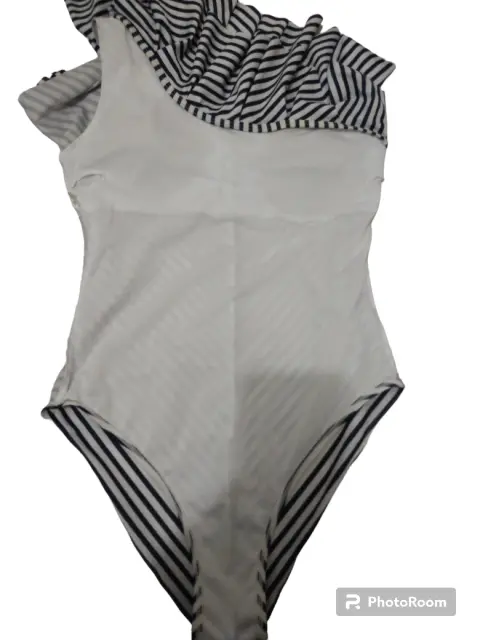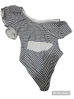 Traje de baño. Color. Blanco/franjas azul marinoVuelos al frente, un hombro descubiertoForrado en su interior al frente82% poliamida 18% elastano