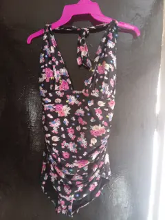 Traje de baño floreado tipo halter con pliegues al frente que te ayudan a dar mejor figura en tu cuerpo, marca ilusión