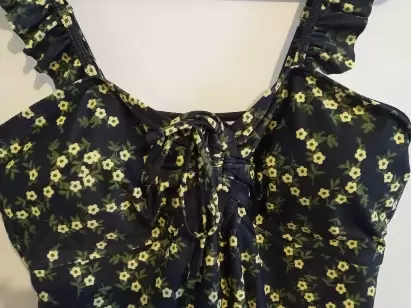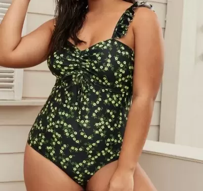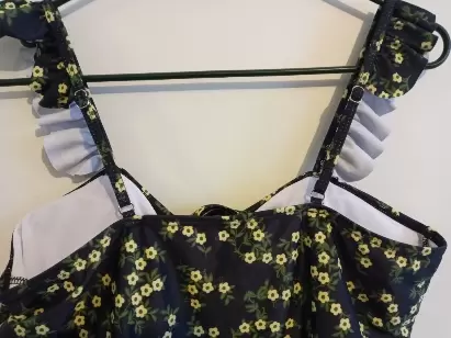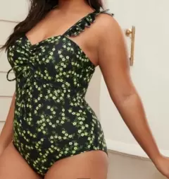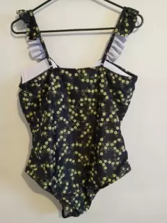 Traje de baño Estampado floral de margaritas, fondo negro. Tirantes ajustables finos, con detalle de volante. Con forro y espacio para protector en área de bra. Largo 79 cm Pecho 96 cm Cintura 90 cm Cadera 100 cm . Composición 85% Naylon 15% Spandex.