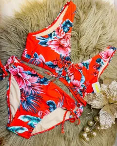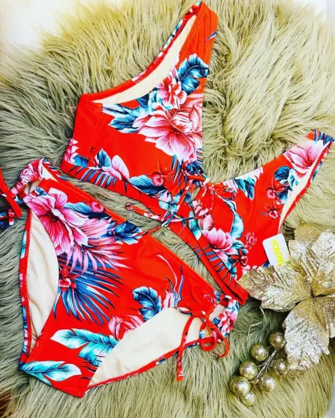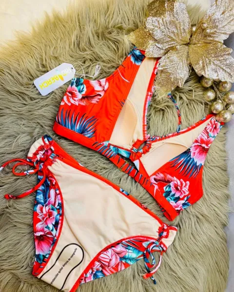 Hermoso set de playa, el cuál incluye un bello traje de baño en 2 piezas completamente nuevo con sello de seguridad, talla: M. Color: rojo, decorado con lindas hojas. Precioso sombrero, que combinará a la perfección con tu traje de baño y ropa de playa favorita.