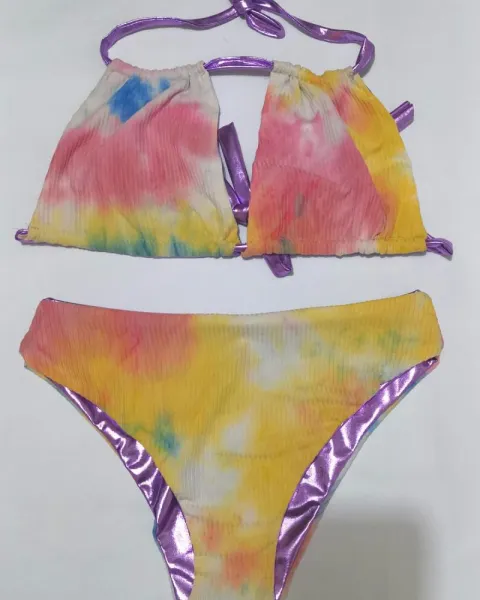 Traje de baño de 2 piezas doble vista :vista metalica lila y vista tie die, parte superior con cintas ajustables, parte inferior strech se ajusta muy bien nuevo sin detalles disponible, también tenemos la Diadema o el scrunchie a juego con costo extra de 60 pesos