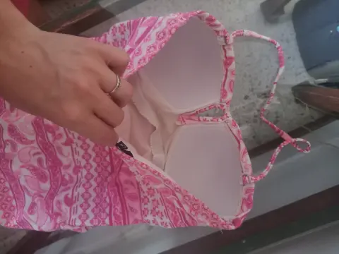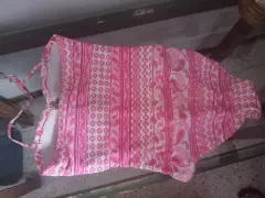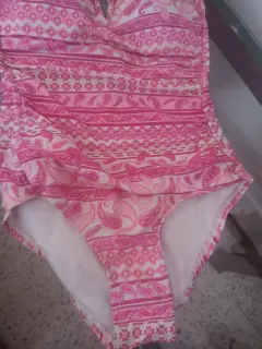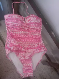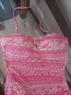 Traje de baño completo color rosa con blanco, talla chica, tipo estraple con cordón al cuello