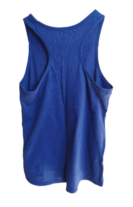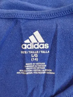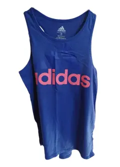 Blusa deportiva, color azul marino sin mangas, marca Adidas con el logo de la marca grande en la parte frontal en color rosa, cuello redondo, talla grande (en niño) queda a una talla chica en adulto.
