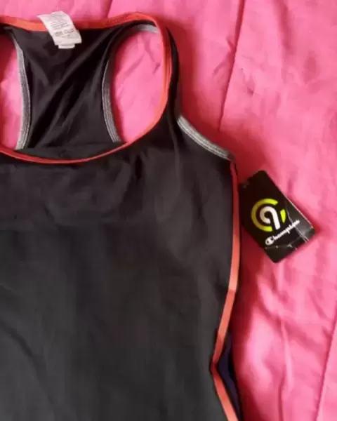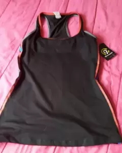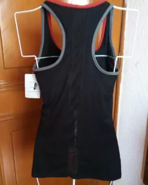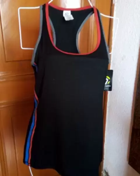 Blusa sin mangas deportiva de licra y algodón color negro y en los costados unas rayas verticales azules y rojas talla XS nueva con etiqueta acentua la figura por su diseño que tiene marcada la cintura con top integrado