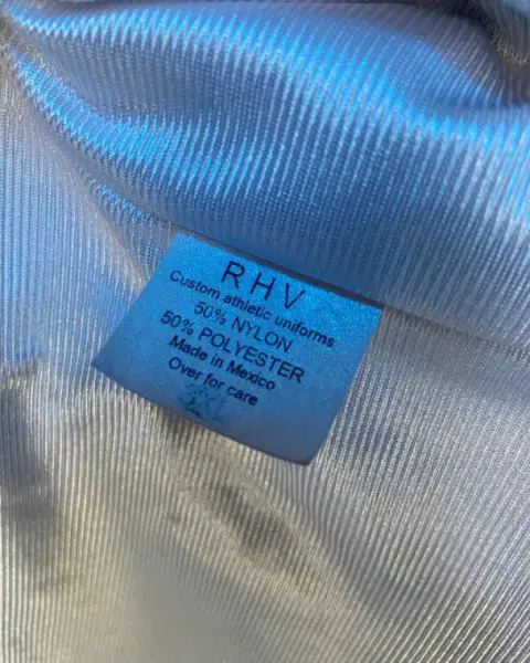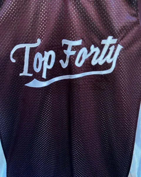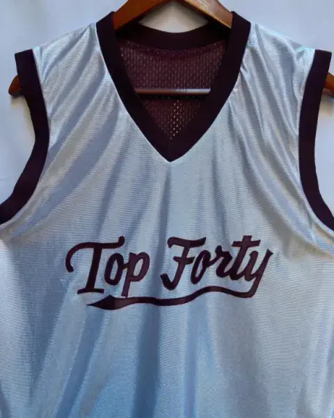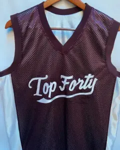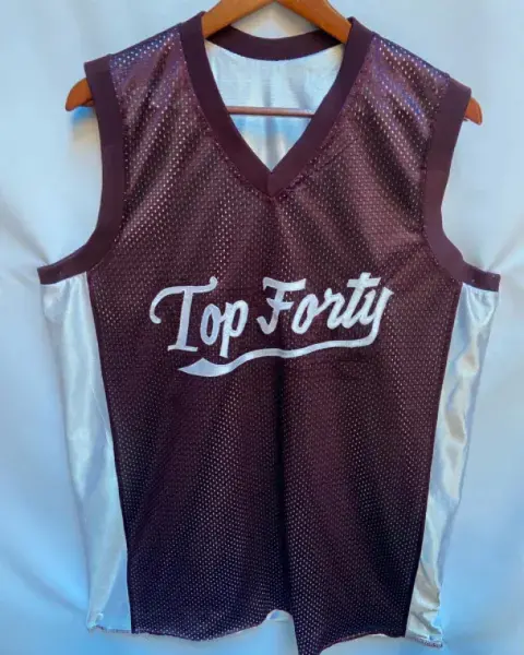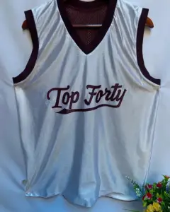 Camiseta de basquetbol doble vista de poliéster tela SPORT en blanco y guinda. Granado en ambos lados de color contrastante. Cuenta con ligero desgaste cerca de la letra T del principio de la lado blanco. El lado guinda es de tela a red y costados blanco.Talla: G (34-38) Marca: RHV