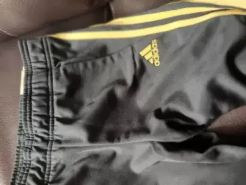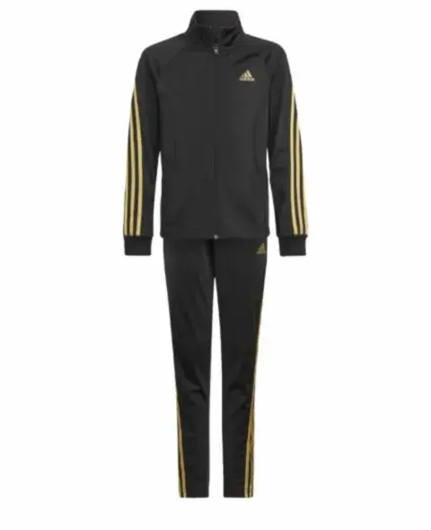Conjunto deportivo Adidas Teens, talla L -14. El color es negro y los detalles de la marca y franjas son doradas, viene semi entubado del pants y tiene bolsas. La sudadera es sin gorro de cuello tipo tortuga, también con bolsas. Es Unisex.