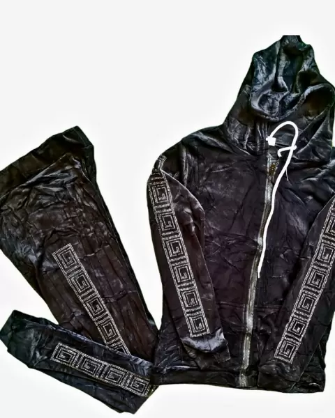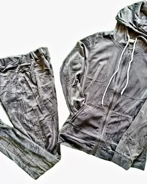 Conjunto de pants incluye pantalón y sudadera, terciopelo, pantalón tipo jogger y aplicación de pedrería en los costados de pantalón y sudadera, tallas M G y XL que va de la 28 a 40, colores negro, gris, morado, vino, marino y chedron
