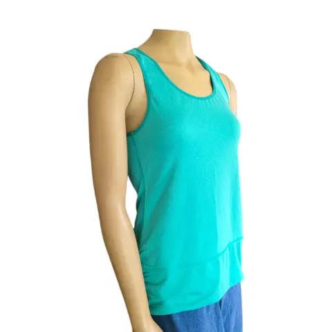 Kirkland Signature Camiseta De Yoga. Kirkland Signature Camiseta De Yoga, talla mediana, color verde claro, tela transpirable, cuello redondo, sin mangas, reforsada en cintura baja, espalda en T, hecho de poliéster y spandex, mide 33cm de hombro a hombro, 37cm de axila a axila, 40cm de cintura con 66cm de largo del hombro hacia abajo nueva a estrenar en buen estado cosmetico