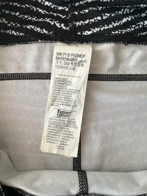 Malla negra con líneas blancas, llega bajo la rodilla, tiro medio, con compresión.Talla: S o XSMedidas: 33 cm de cintura, 36 cm cadera, 20.5 cm de tiro, 47.5 cm de entrepierna.Sin detalles.