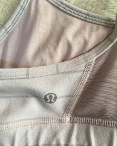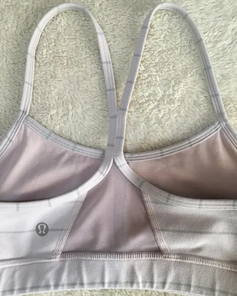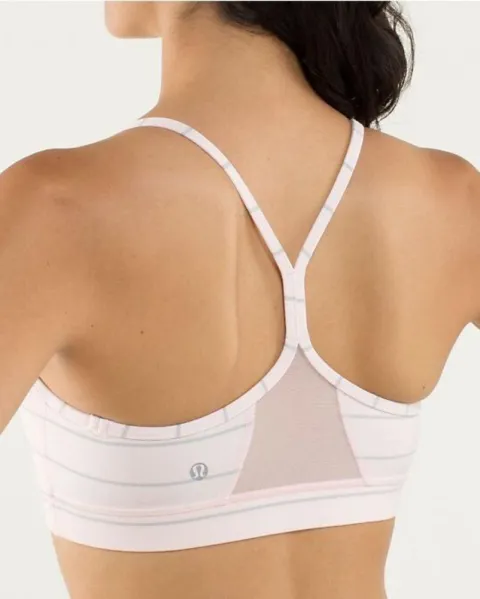 Lululemon flow Y bra IV, color rosa palo con rayas grises, el color del forro es piel, por eso la apariencia, usado pero aún en muy buena condición, soporte medio, talla 4.