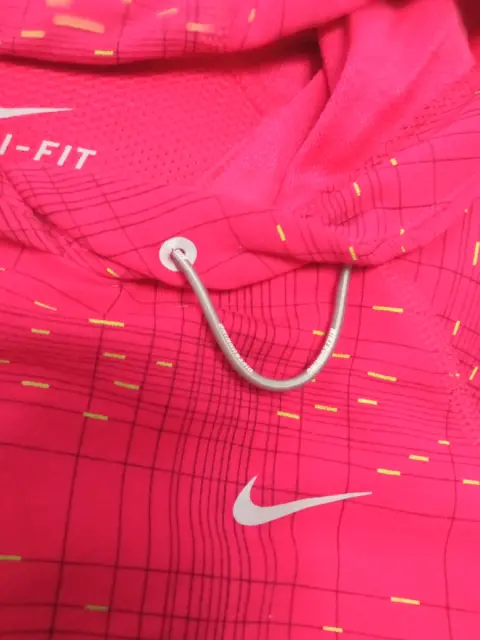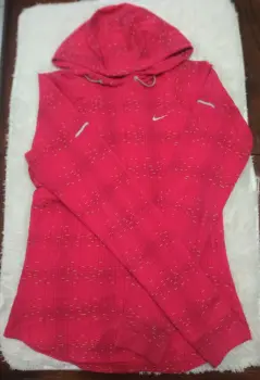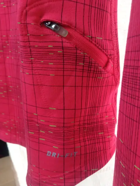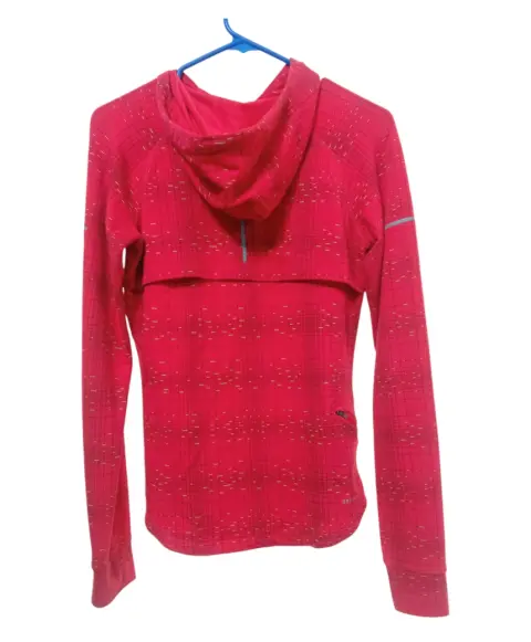 Nike Dri-Fit women sudadera deportiva.. Descripción:Sudadera con capucha atlética para correr Nike Dri-Fit con estampado reflectante en rosa para mujer.Talla: ChicaMedidas: 62 cm de largo, 86 cm ancho de axila a axila, 58 cm de largo de mangas.Usada en excelentes condiciones tal como se ve en las imágenes.