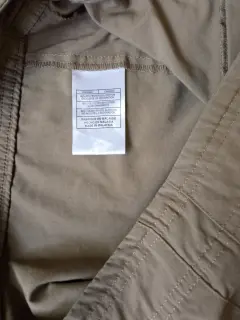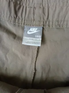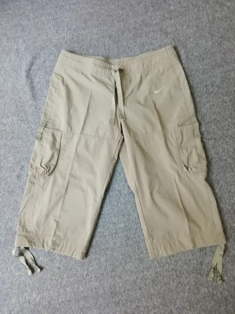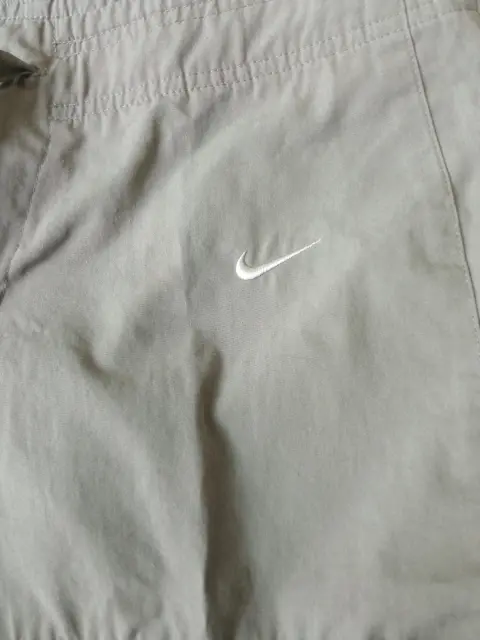 Pantalones Nike para Senderismo/Exterior Capri Verde Oliva Cordón Cintura Talla Small (4-6).Pantalón capri cargo Nike con 2 bolsillos, cierre con cremallera, gancho y cordón, cordón en el tobillo.Material: 65% poliéster y 35% algodón.Medidas:55 cm de largo, 84cm de ancho en cintura, 104 cm de ancho en cadera.