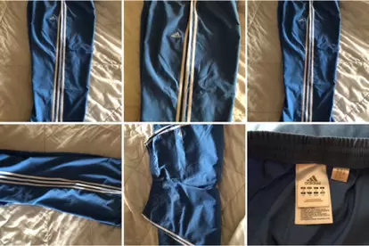 Pans corto azul con franjas blancas marca Adidas . Tiene como detalle un jalón y mancha bastante pequeño, lo pongo en las fotos .
