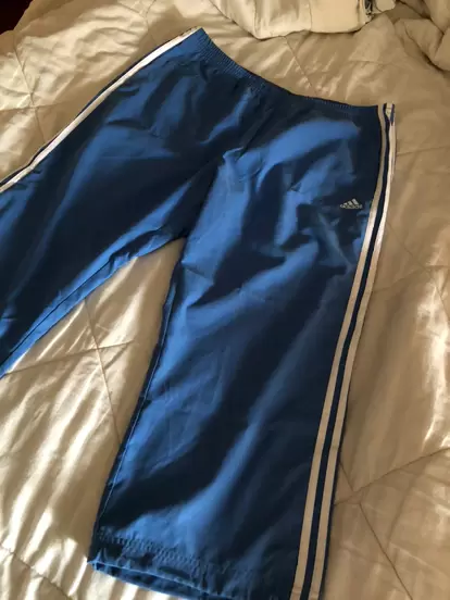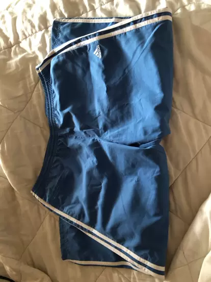 Pans corto Adidas. Pans corto azul con franjas blancas marca Adidas . Tiene como detalle un jalón y mancha bastante pequeño, lo pongo en las fotos .