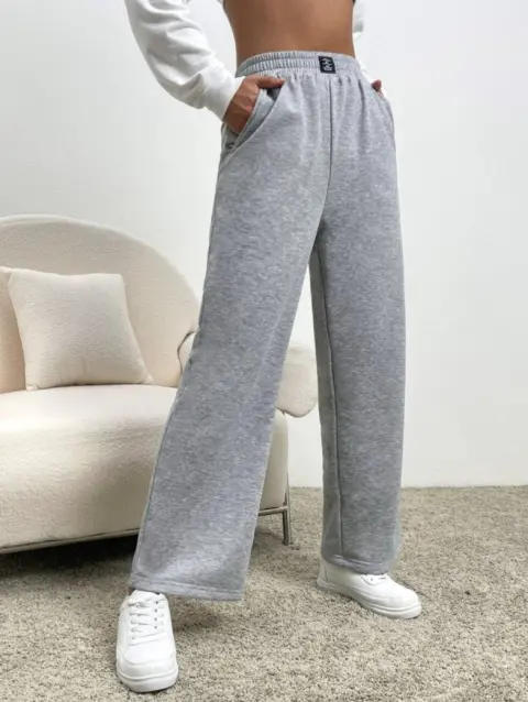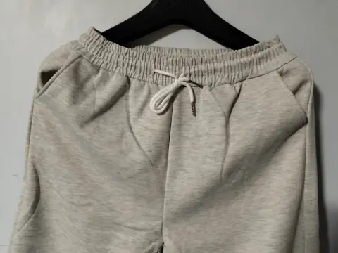 Pantalón pants corte recto color gris claro afelpado por dentro con resorte en cintura y cordón para mayor ajuste tiene bolsas en los costados así luciría puesto como en foto 1 ilustrativa no estira mucho pero da desde una talla 9/11 mexicana está muy lindo 👖👟🛍️