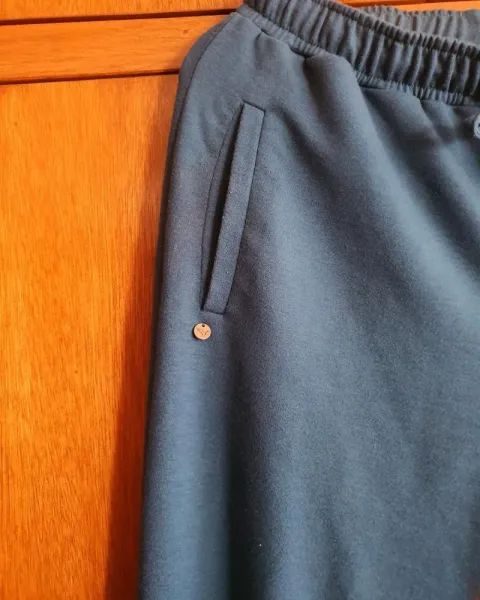 Pants suave al tacto en color azul, con elástico en la cintura y cintas para hacer moño. Al final de la pierna es en puño