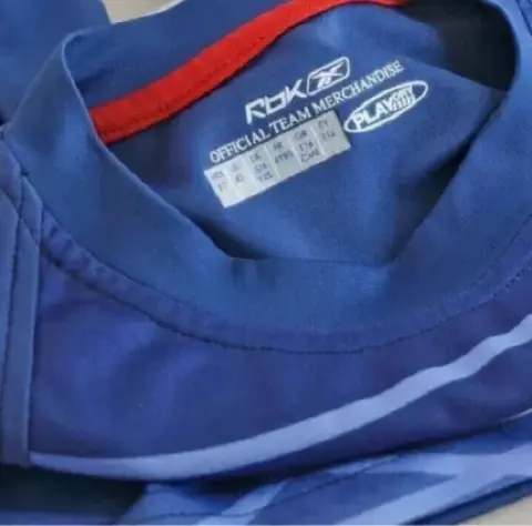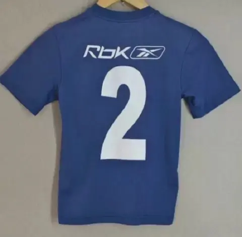 Playera azul guadalajaraazul talla 6. Playera azul con blanco del Guadalajara, es para niño, en el pecho trae el escudo del equipo y en la espalda trae el número 2, tiene mangas cortas, el número de atrás está un poco desgastado, único detalle la marca es Reebok y la talla es 6.