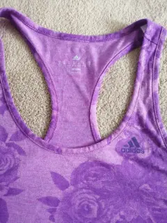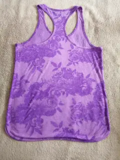 Playera deportiva floreada, tono morado y lila, T-M, axila 46 cms., largo 70 cms. ( tomando en cuenta los tirantes) aberturas laterales.