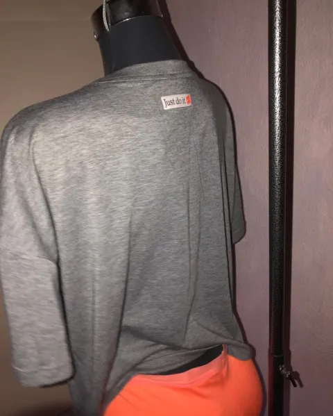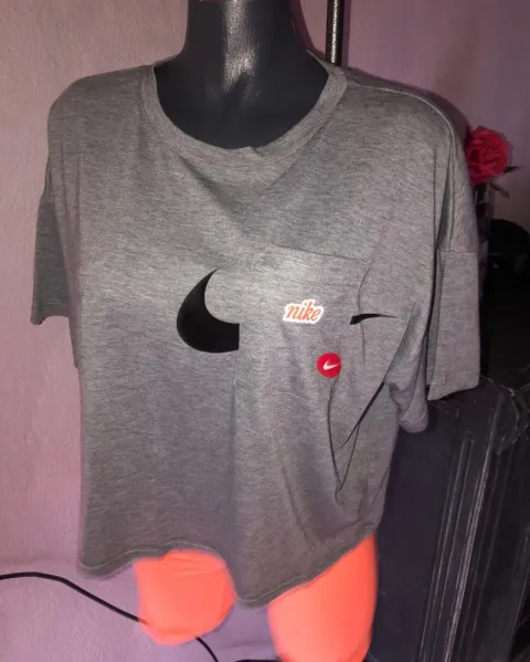 Playera Nike preciosa con estampado y bolsillo. Es holgada pero llega poco bajo del ombligo, muy linda Más barata que en tienda