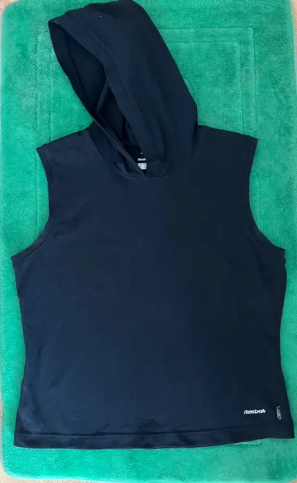 Playera deportiva NegraT-L , Reebok Original, sin mangas, con gorro, sin detalle. Excelente calidad.