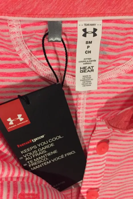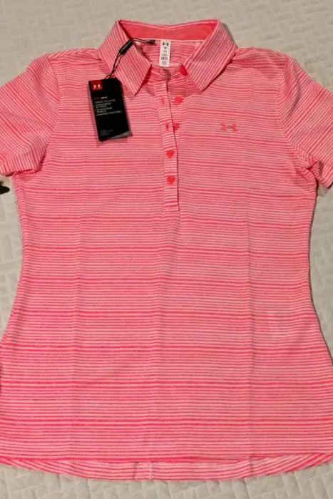 Playera tipo polo de botones, tela "HeatGear" que atrapa el sudor para mantenerte seca, con logo frontal lado izq y atrás abajo del cuelloPoliéster / ElastanoMedidas: Hombros 38cm, Busto 45cm, Largo 62cm