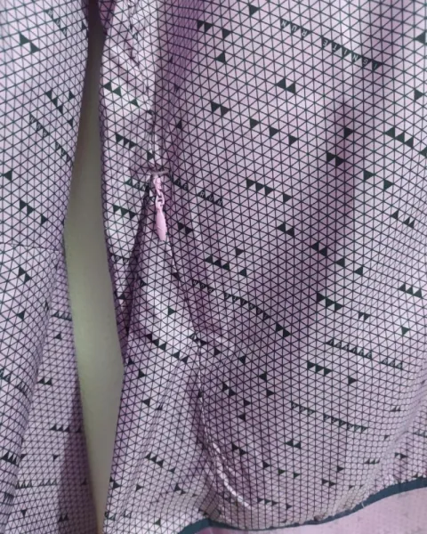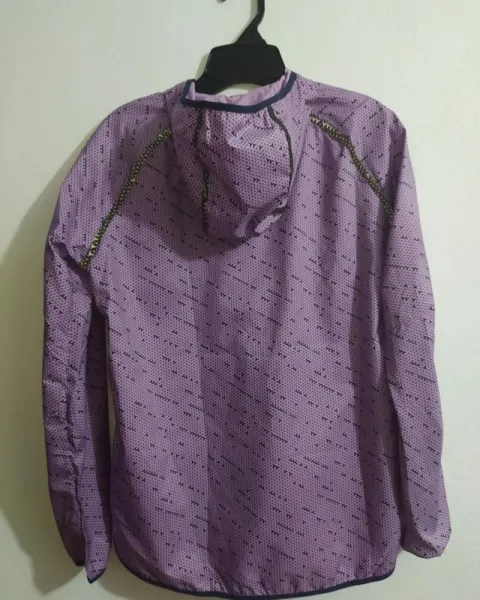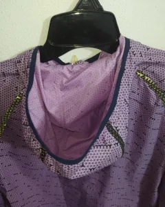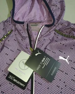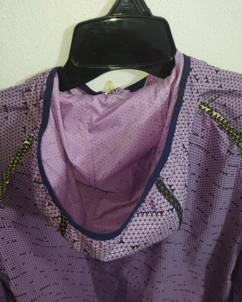 Rompevientos deportiva color morado con trama de triángulos color negro. Diseñada especialmente por la marca Puma para corredores. Tiene reflejante de seguridad 360° para mayor visibilidad en todo momento. Trae dos bolsos delanteros con cierre y capucha. Talla Mediana.
