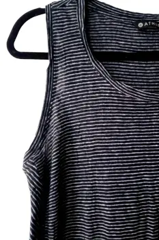 Tank top de lino a rayas negras y blancas de la marca Athleta talla M. El producto es usado en excelentes condiciones sin detalles. Proviene de un hogar libre de humo de tabaco y mascotas.Medidassisa: 47 cmscadera: 55 cmslargo: 66 cms100% lino