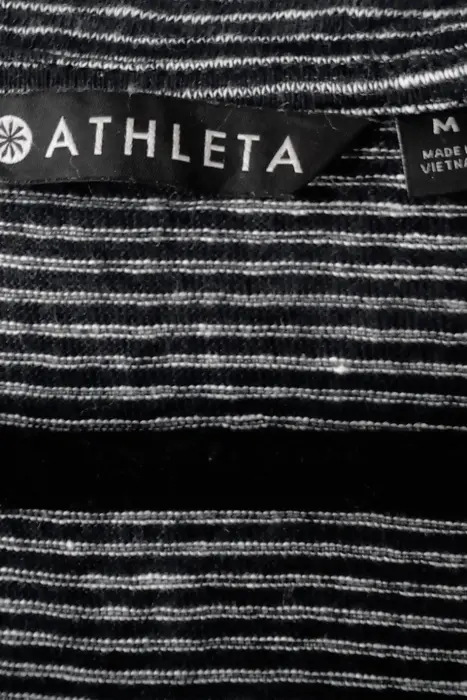 Tank top a rayas Athleta. Tank top de lino a rayas negras y blancas de la marca Athleta talla M. El producto es usado en excelentes condiciones sin detalles. Proviene de un hogar libre de humo de tabaco y mascotas.Medidassisa: 47 cmscadera: 55 cmslargo: 66 cms100% lino
