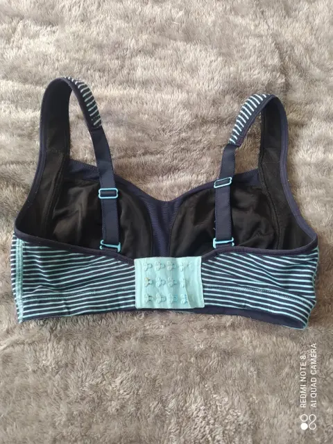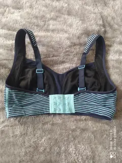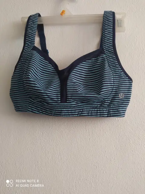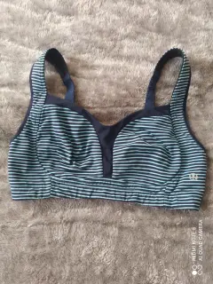 Bonito top deportivo color azul de rayas, no tiene las almohadillas, poco desgaste en broches, talla 6/ S , en buen estado.
