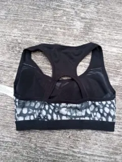 Es un top deportivo en estampado negro y gris, cómodo para el gym, tiene copas removibles. Mide 55 cm del elástico de debajo del busto.