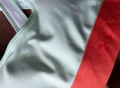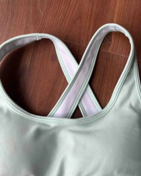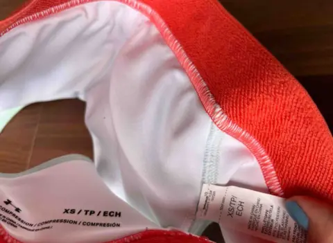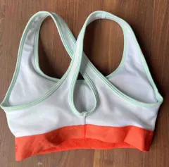 Bonito top deportivo talla xs (justo a su talla no da a más ) , color azul clarito con naranja , tiene copas que se pueden quitar .