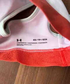 Top deportivo Under. Bonito top deportivo talla xs (justo a su talla no da a más ) , color azul clarito con naranja , tiene copas que se pueden quitar .